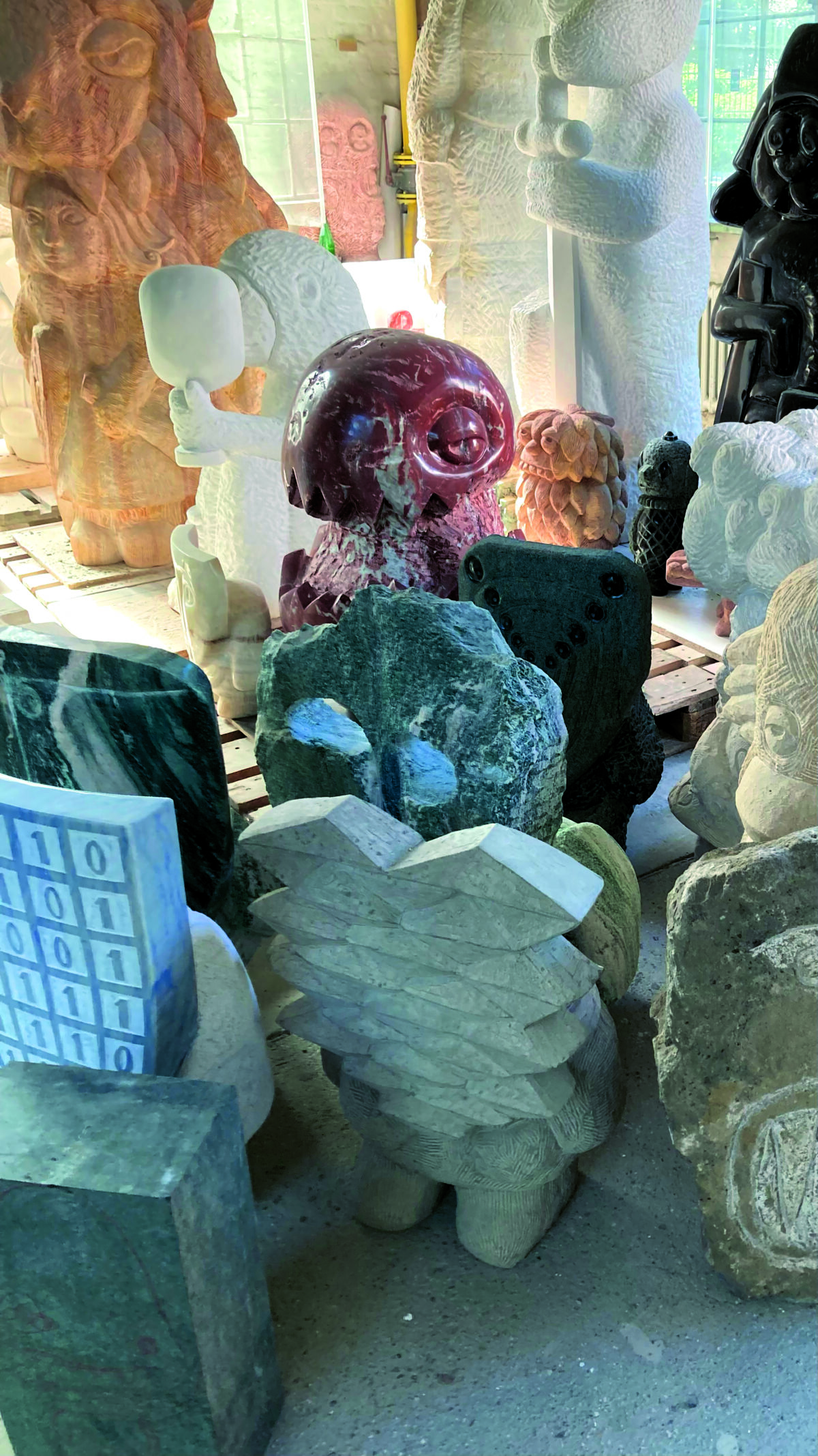 Unter seinen Händen wachsen sich rohe Gesteinsbrocken zu unbekannten sublimen Wesen aus. Schon bei der Vorauswahl der jeweiligen Steinart denkt er die für das Material spezifischen Bearbeitungsmethoden mit, um der allure der zukünftigen Skulptur gerecht zu werden. Mit der Kennerschaft des Steinmetzes kann sich sein Blick sprunghaft vom eher spröden, lehmfarbenen Elbsandstein hin zum harten und farbintensiven blauen Macauba- oder grünen Atlantis-Quarzit wenden, um unvermutet einen Block schneeweißen Statuario-Marmor, das Nonplusultra jedes klassischen Bildhauers, für seine nächste folie ins Auge zu fassen. Die Material-Melange seines Skulpturenparks beschwört ein phantastisches Panoptikum flirrender Lebensgeister herauf, denen er Leben einhaucht. Mit ihrem vielfach überdrehten Habitus erinnern sie an Picassos extraterrestrische Gaukler der blauen und rosa Periode. Wie sie bevölkern Rincks Statuen unsere Lebenswelt, ohne unsere Realität zu teilen. Das macht sie für uns so anziehend. Unvermittelt werden wir berührt von der Fremde ihres märchenhaften Habitats, das aus der Nähe, aber mit sicherem Abstand betrachtet, unserer menschlichen Natur mit ihren Sehnsüchten und Ängsten nicht unähnlich ist.