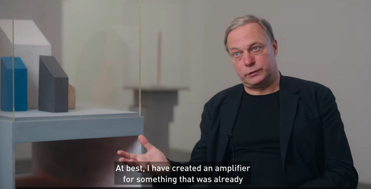 In dieser Folge ONE ON ONE spricht der Maler und Bildhauer Thomas Scheibitz (*1968) über das „Ensemble aus acht farbigen Baukörpern” (1977–80) des konstruktivistischen Malers und Bildhauers Hermann Glöckner (1889–1987), für das er ein Plateau gefertigt hat. Er reflektiert über die variable Anordnung der Formen, persönliche Erinnerungen an Glöckners Werk und die Verbindung zur eigenen Bildsprache.